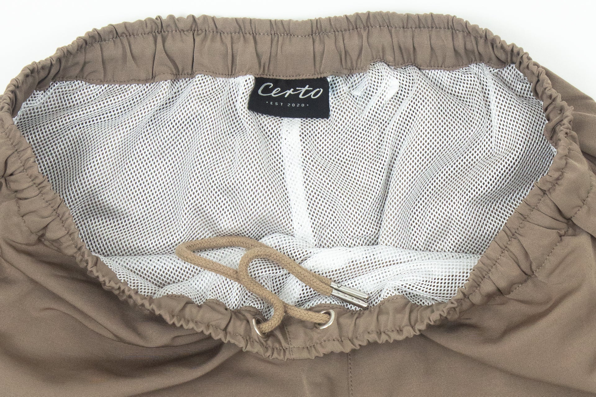 Waistband: elastic waistband with metal lace cap on the waist inside Fit: decent trapped leg Fabric: 100% polyester Inner lining : 100% polyester mesh black/white Pockets 2: left / right with hidden zippers Logo: white embroidered lettering on the left leg wash / robustness : 10/10